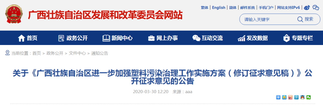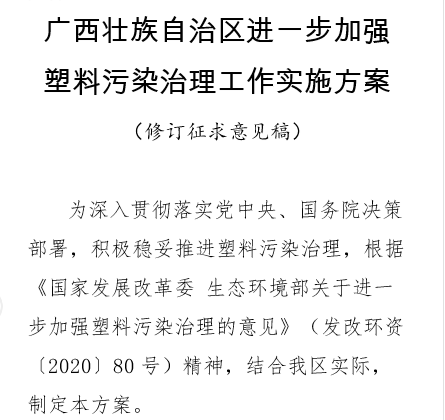 有关单位和社会各界人士可于2020年4月3日前,登陆自治区发展改革委门户网站(http://fgw.gxzf.gov.cn)首页“通知公告”专栏中,对《广西壮族自治区进一步加强塑料污染治理工作实施方案(修订征求意见稿)》,提出意见建议。意见建议请发送至电子邮箱:huanzichu@gxi.gov.cn,联系电话:0771-2328386。附件:《广西壮族自治区进一步加强塑料污染治理工作实施方案(修订征求意见稿)》到2020年,率先在部分地区、部分领域禁止、限制部分塑料制品的生产、销售和使用。到2022年,全区一次性塑料制品消费量明显减少,替代产品得到推广,塑料废弃物资源化能源化利用比例大幅提升;在塑料污染问题突出领域和电商、快递、外卖等新兴领域,推动形成塑料减量和绿色物流模式。到2025年,全区塑料制品生产、流通、消费和回收处置等环节的管理制度基本建立,多元共治体系基本形成,替代产品开发应用水平进一步提升,城市塑料垃圾填埋量大幅降低,塑料污染得到有效控制。一、禁止生产、销售的塑料制品。严格执行《产业结构调整指导目录》等产业政策,禁止生产和销售厚度小于0.025毫米的超薄塑料购物袋、厚度小于0.01毫米的聚乙烯农用地膜;禁止以医疗废物为原料制造塑料制品;到2020年底,禁止生产和销售一次性发泡塑料餐具、一次性塑料棉签;禁止生产含塑料微珠的日化产品;到2022年底,禁止销售含塑料微珠的日化产品。对塑料制品禁止类项目不予审批、核准和备案。加强塑料制品生产和销售企业管理,按照规定时限淘汰塑料制品禁止类生产线,督促塑料制品生产、销售企业建立购销台账制度,杜绝不合格塑料制品流入市场,停止销售禁止类产品。加强医疗废物管控和集中处置单位环境监管,严格执行全面禁止废塑料进口政策,继续加大对固体废物进口监管力度。